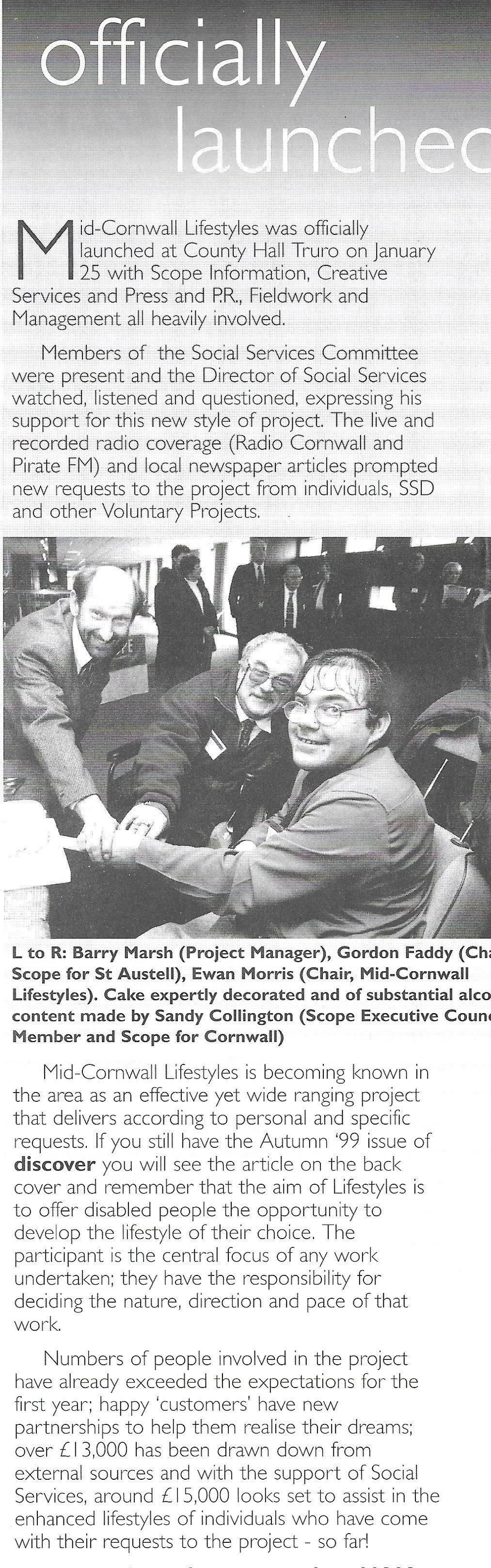 Mid-Cornwall Lifestyles started in 1999 as a project from a concept first developed by a group of disabled people who wanted to develop their own lifestyles. They received a development grant of £5000 to enable them to do just that. Within the first year they won a lottery bid worth nearly £123,000 which enabled the project to begin - helping disabled adults live the lifestyles of their choice. Many of these founding members remain Trustees of the charity to this day …