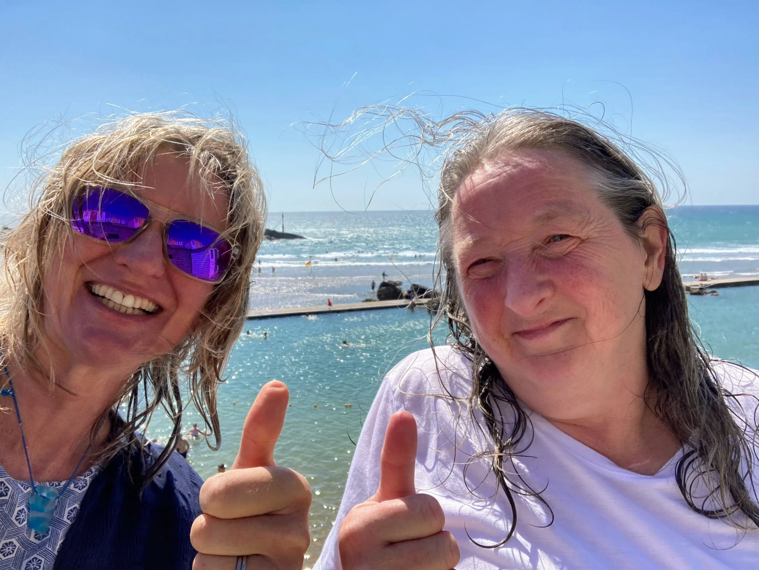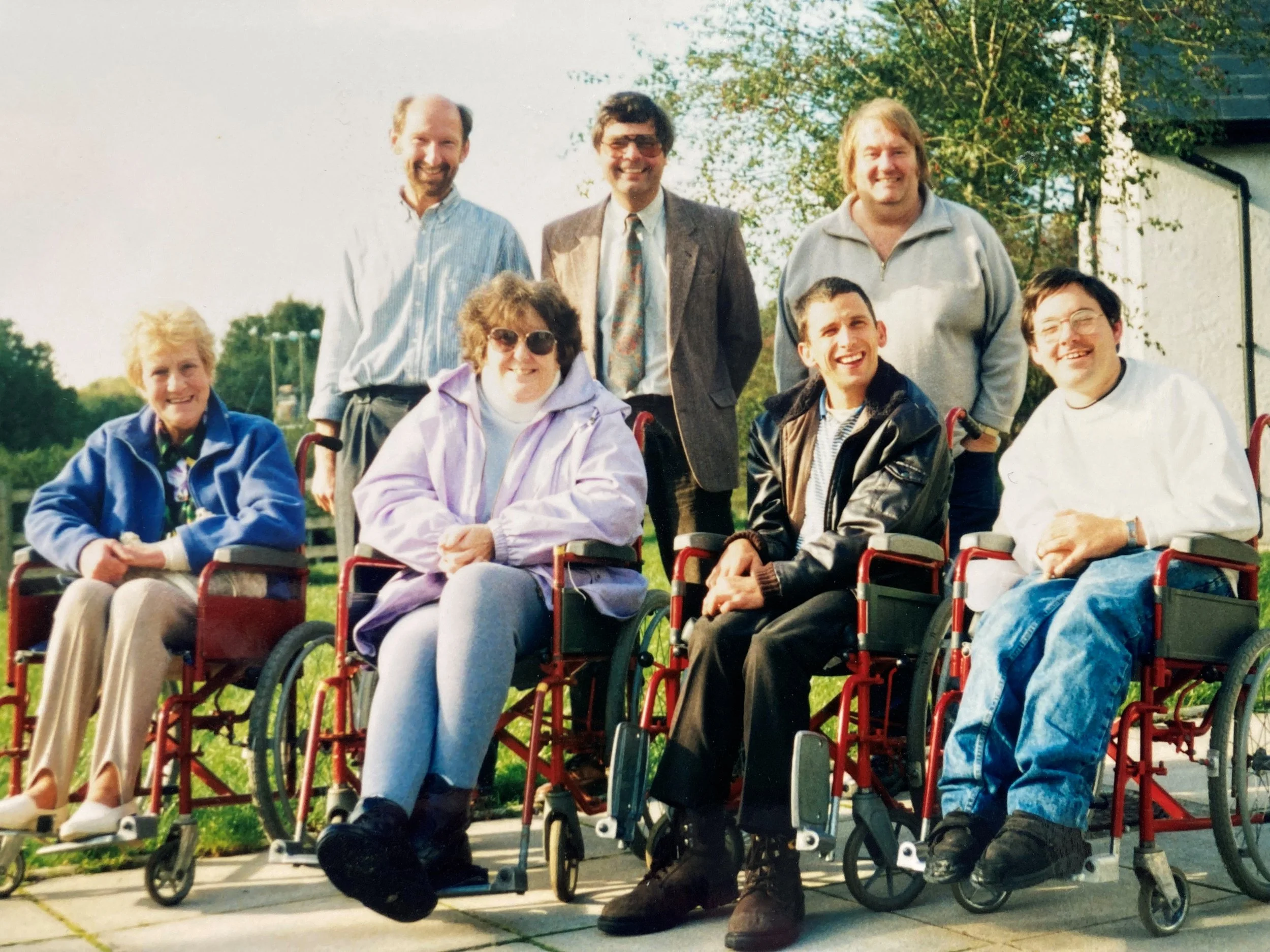 Group photo of seven people, some in wheelchairs, outdoors on a sunny day.
