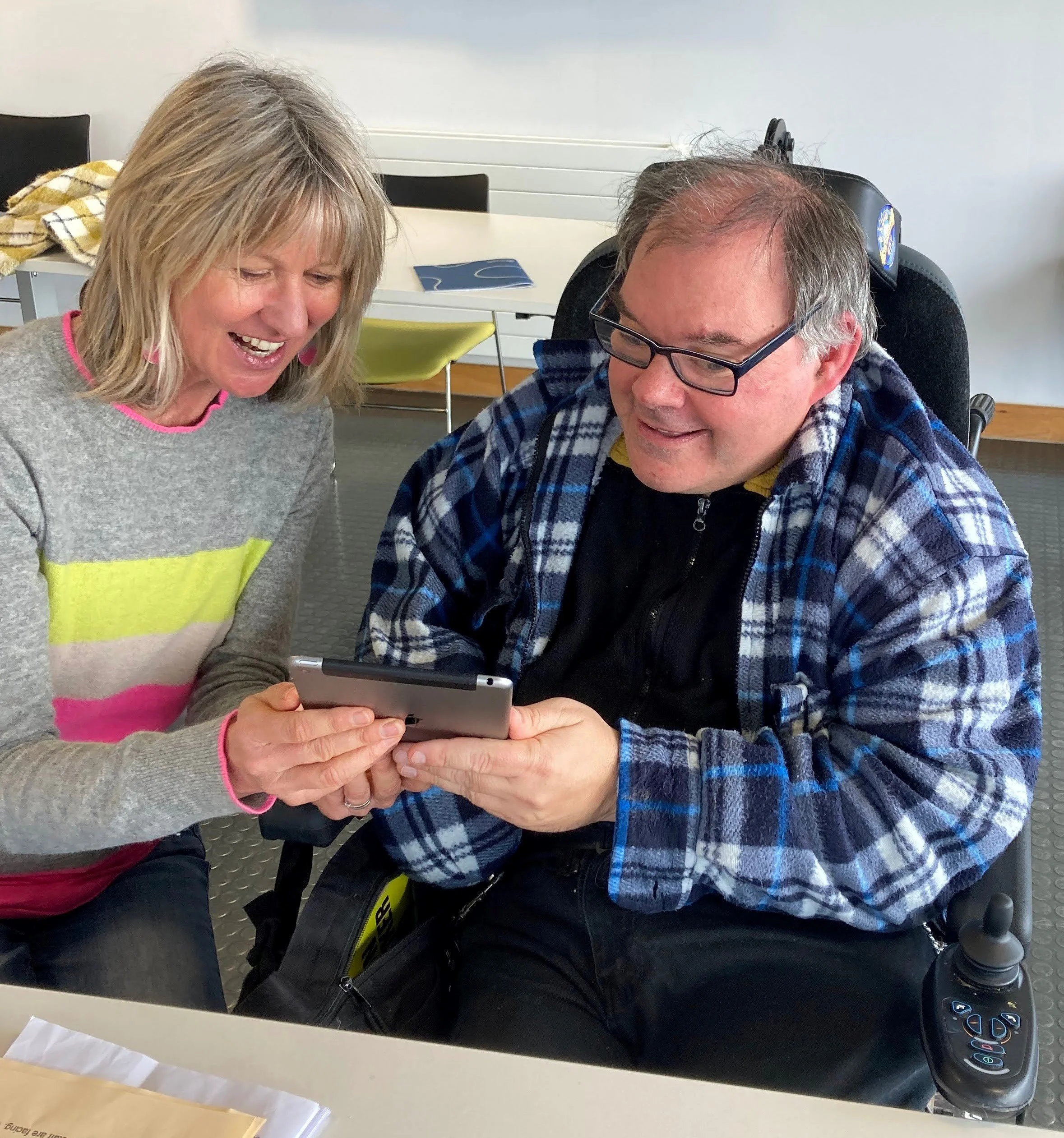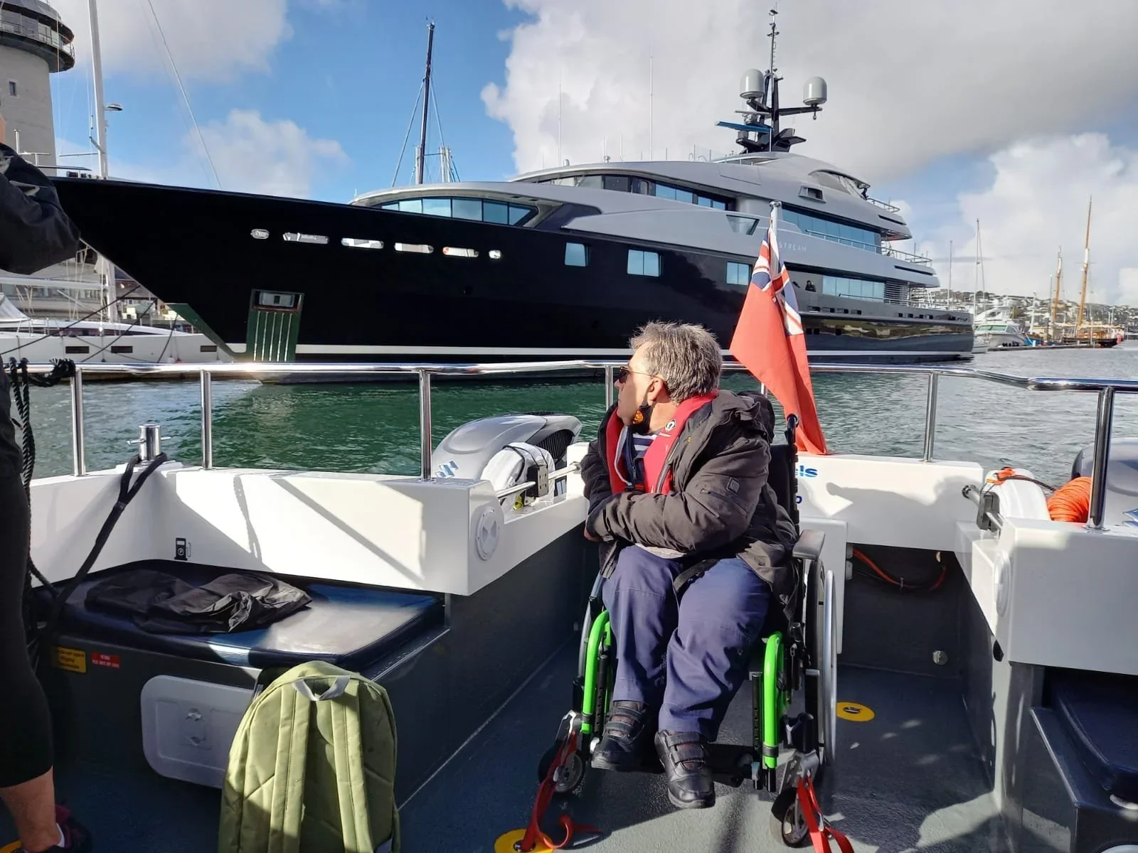 A man in a wheelchair smiling outdoors near a pond with people relaxing and walking, a large historic building on a hill in the background, and cloudy sky.