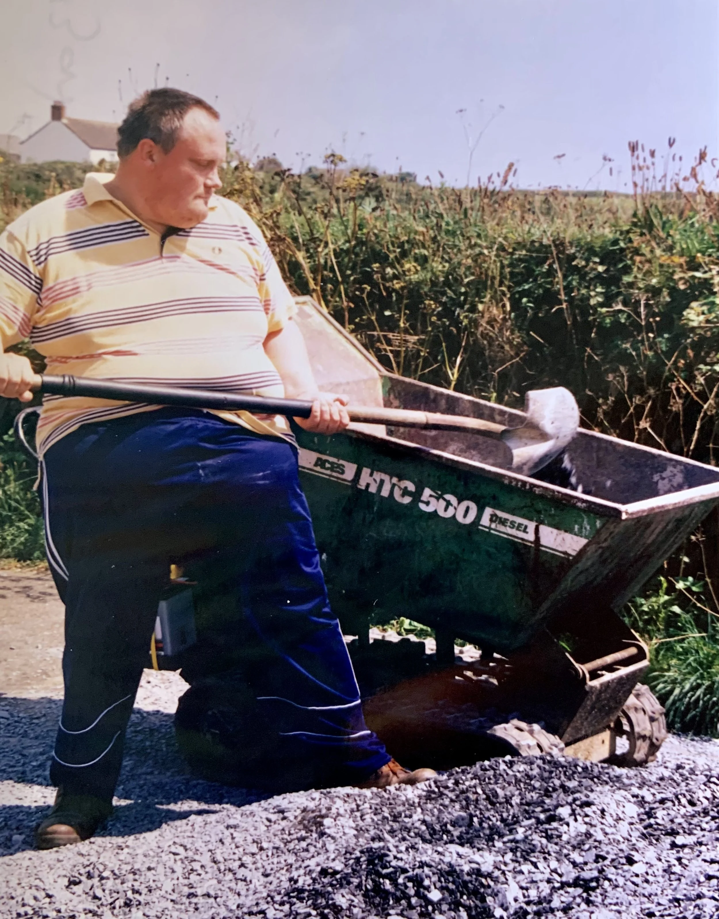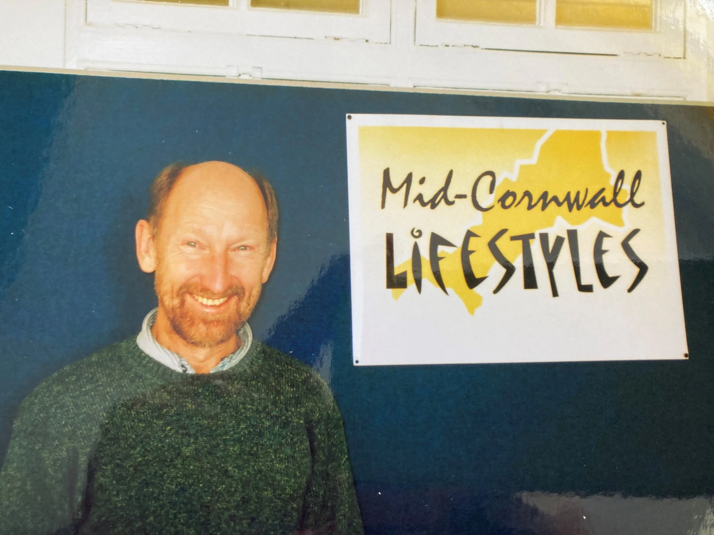 A smiling man with a beard and short hair standing in front of a sign that reads 'Mid-Cornwall Lifestyle' against a dark blue background.