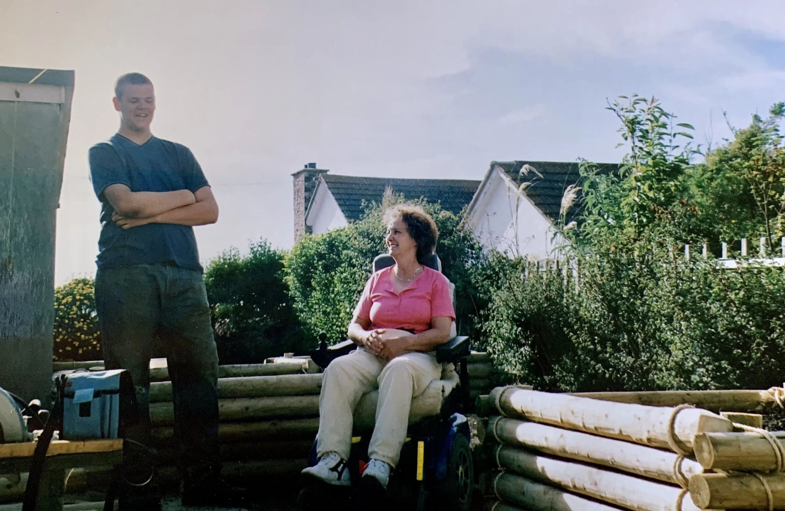 A young man standing outdoors with his arms crossed, smiling at an elderly woman sitting in a motorized wheelchair, surrounded by greenery and a clear blue sky.