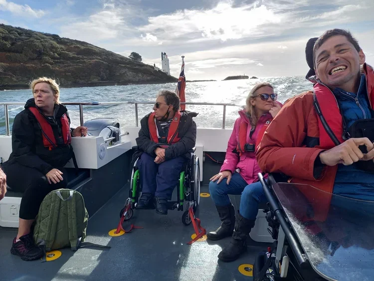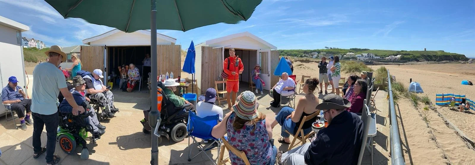 Group of eight people, some in wheelchairs, outdoors on a sunny day