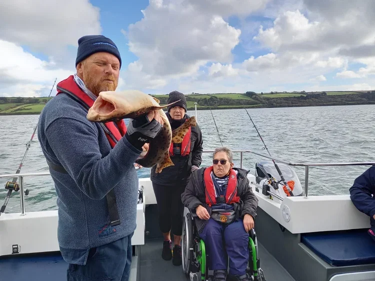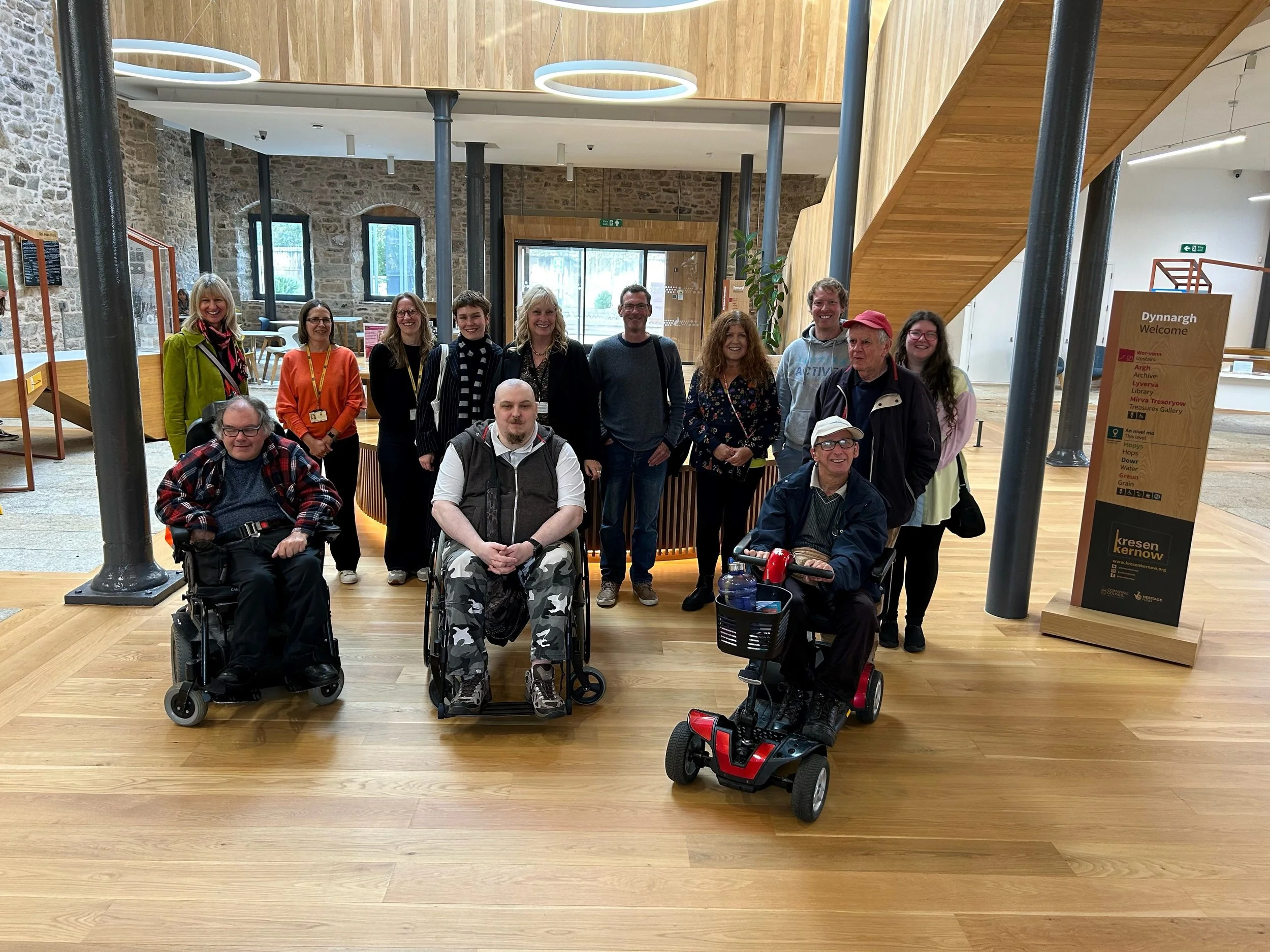 Group of eight diverse individuals in a classroom or community center, some seated and some standing, with shelves and educational posters, including a banner that reads 'Mid-Cornwall Lifestyles' in the background.