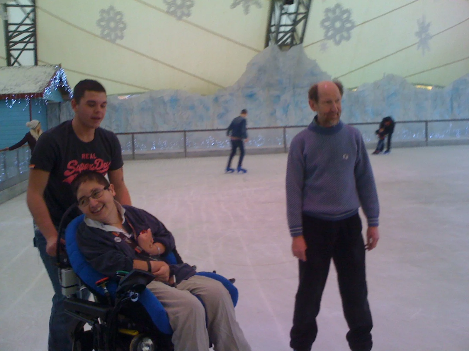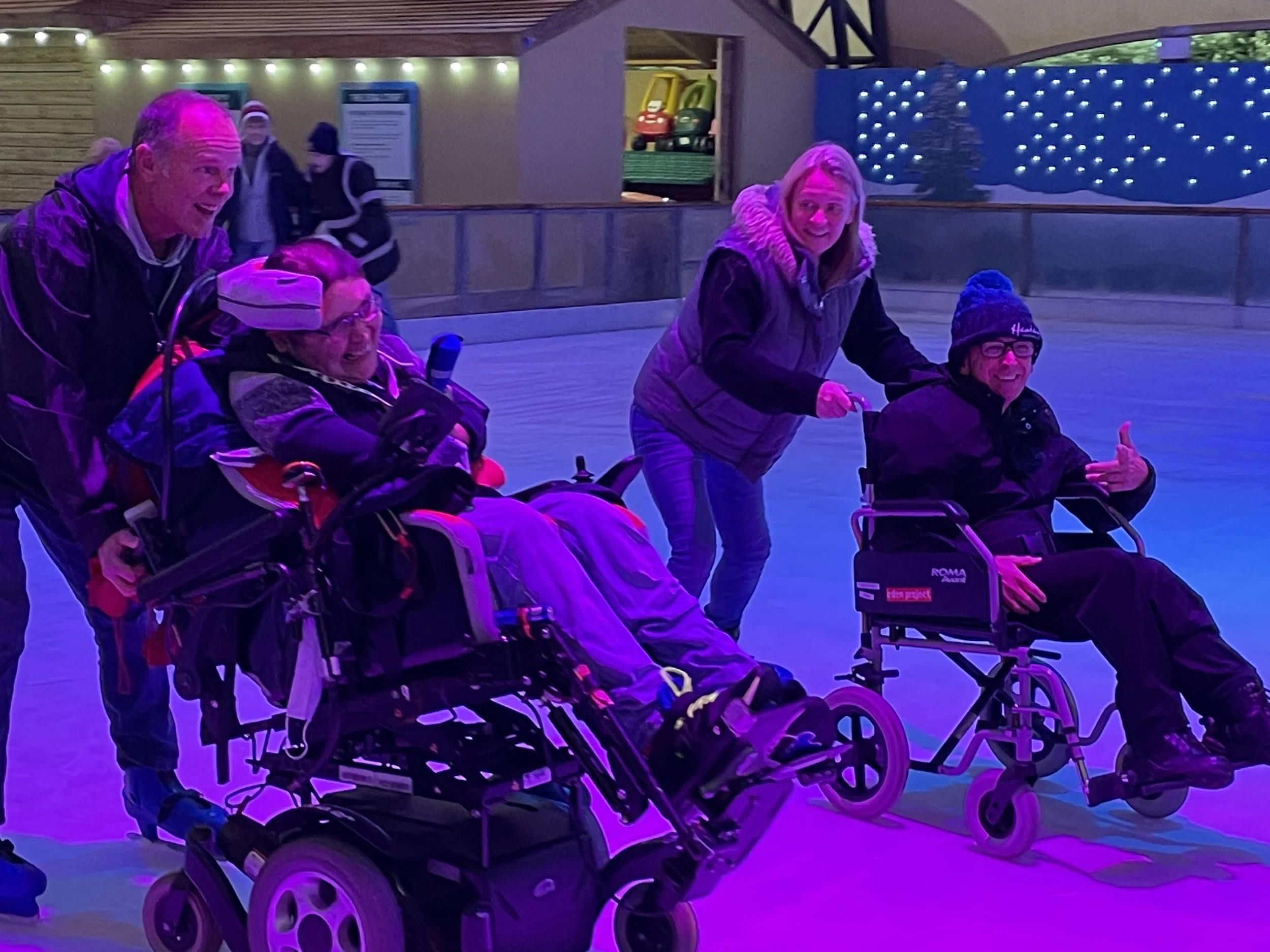 Four people in an indoor ice skating rink; two men, one pushing a young man with a disability in a wheelchair, and another man standing nearby; snowflake decorations on the walls.