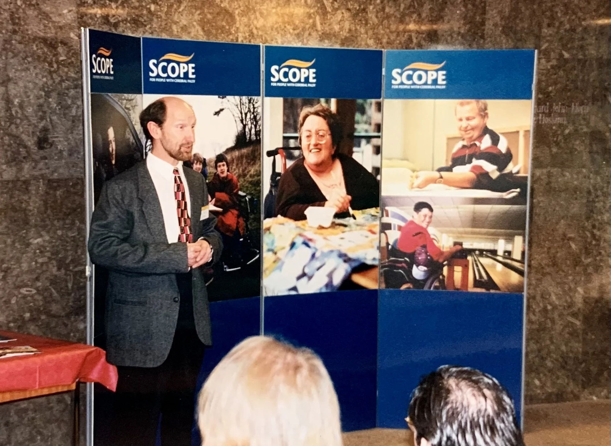 A person standing next to a three-panel display with photographs of various people, including a man in a suit outdoors, a woman smiling at a table, and a young boy in a striped shirt in a classroom, all under a blue banner with the word 'SCOPE' and t