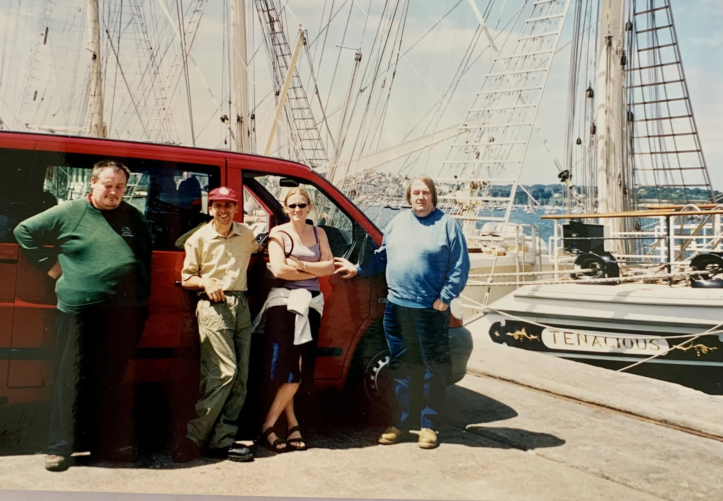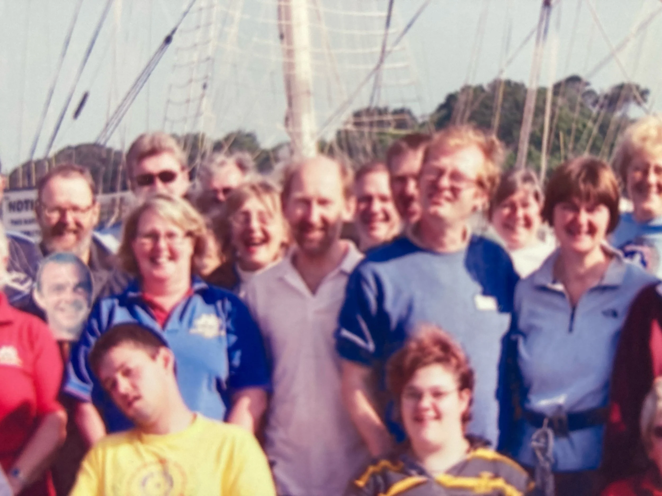 A group of people smiling and posing together outdoors near a large boat or ship, with masts and rigging visible in the background.