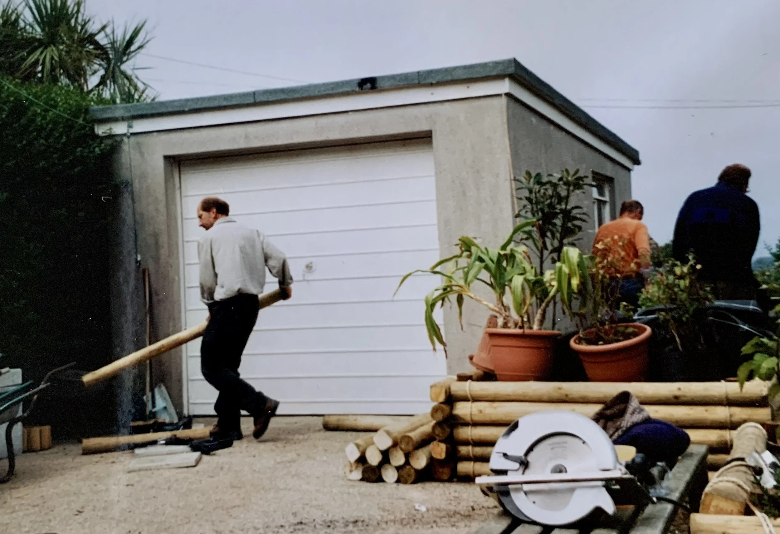Three men working outdoors near a small shed or garage, with planks of wood and potted plants nearby.