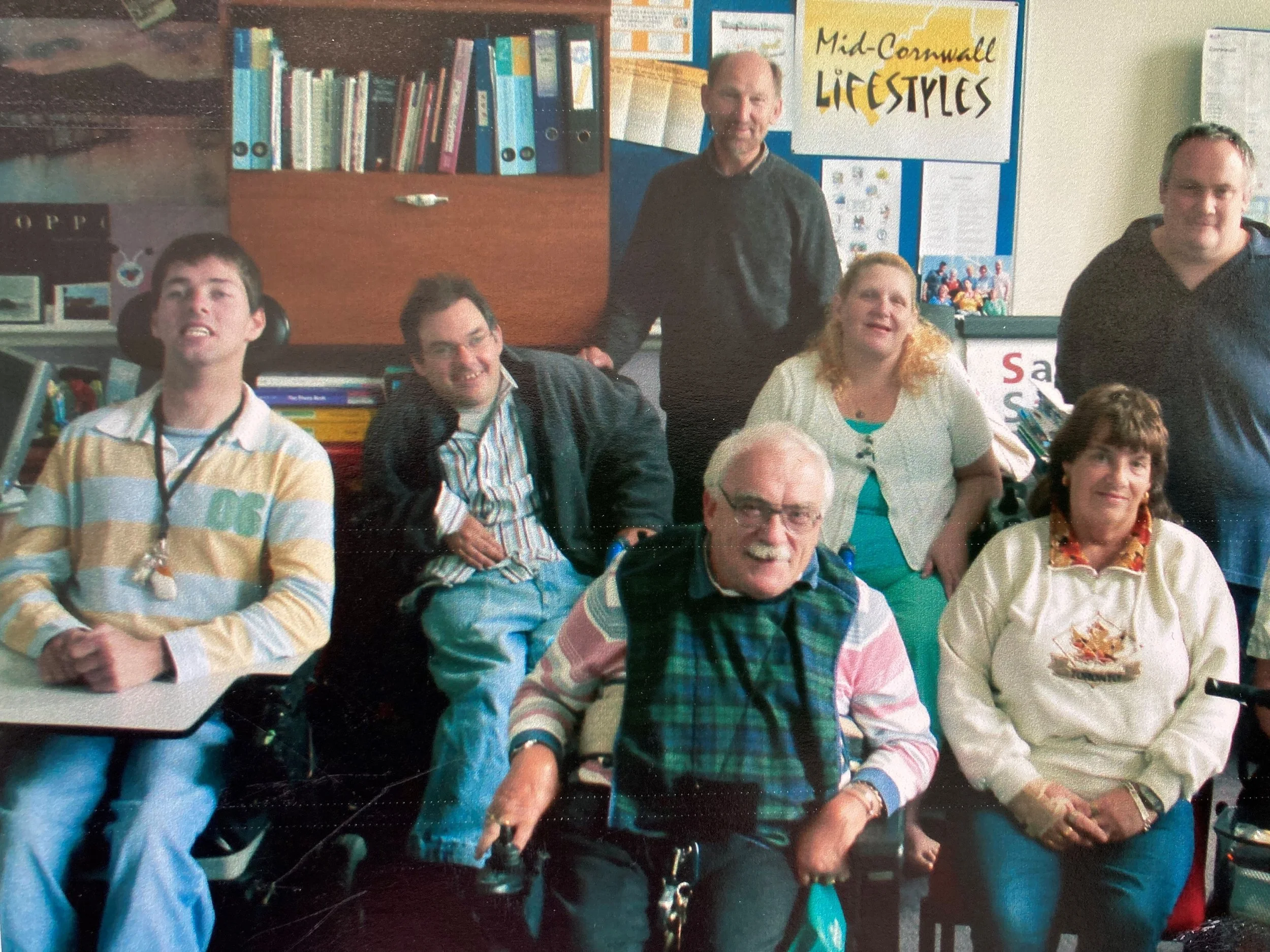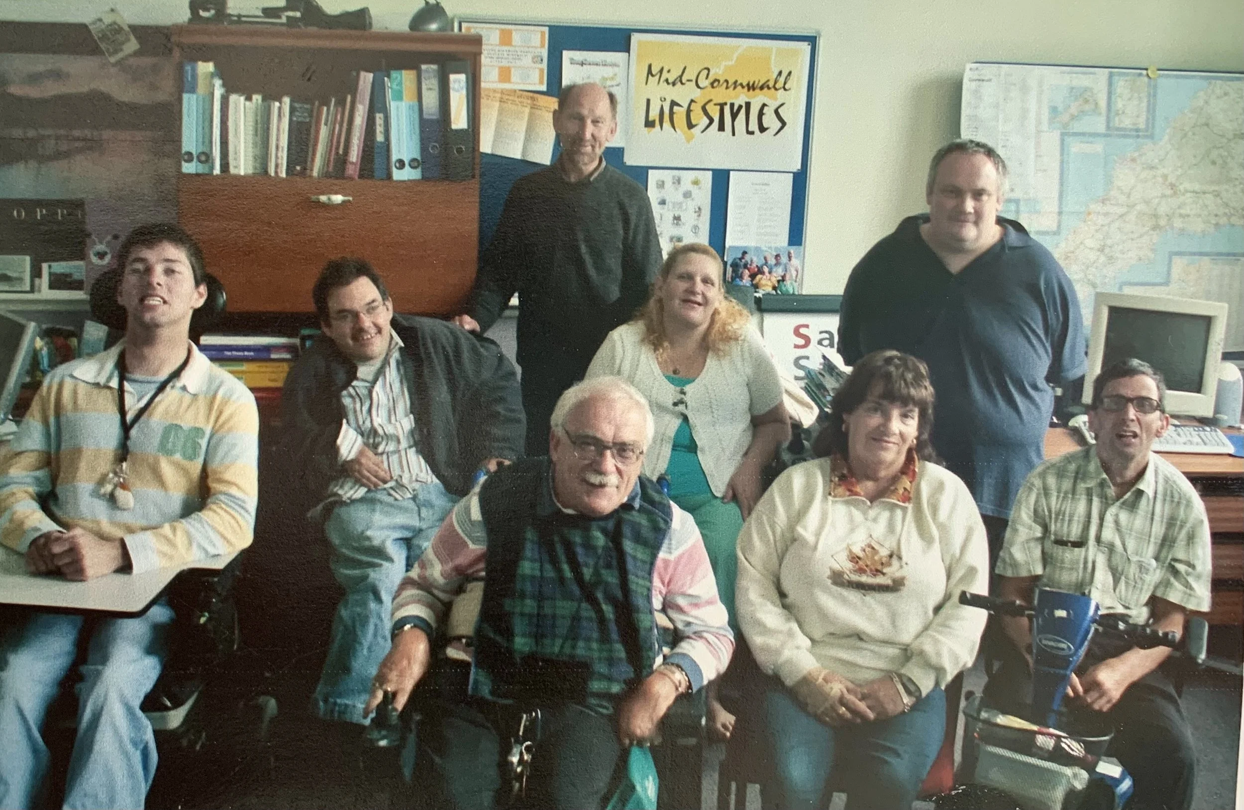 A group photo of nine people in an office, with books, maps, and a computer. A sign reads 'Mid Cornwall Lifestyles'.