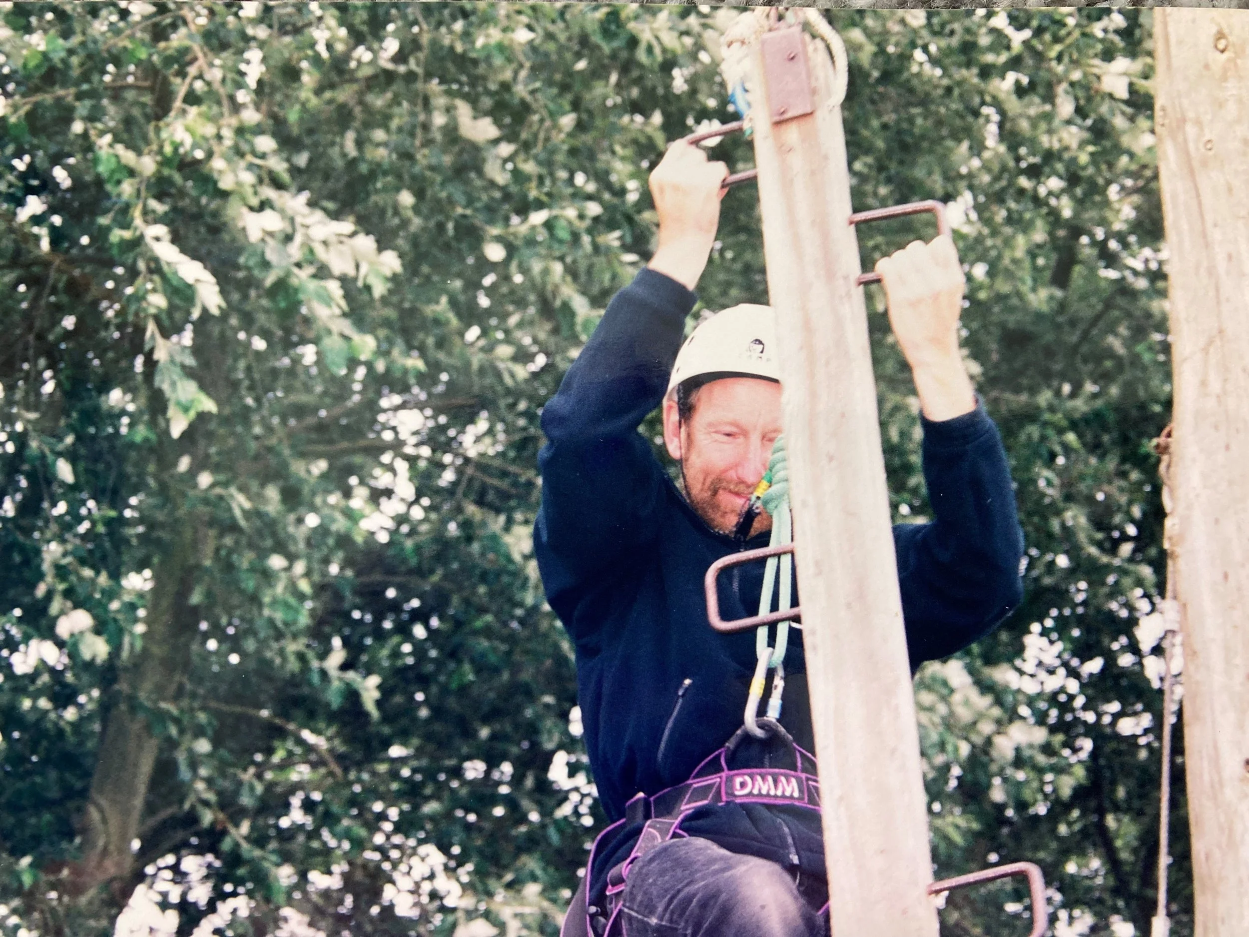 A man wearing a safety helmet and harness climbing a wooden utility pole using metal steps.