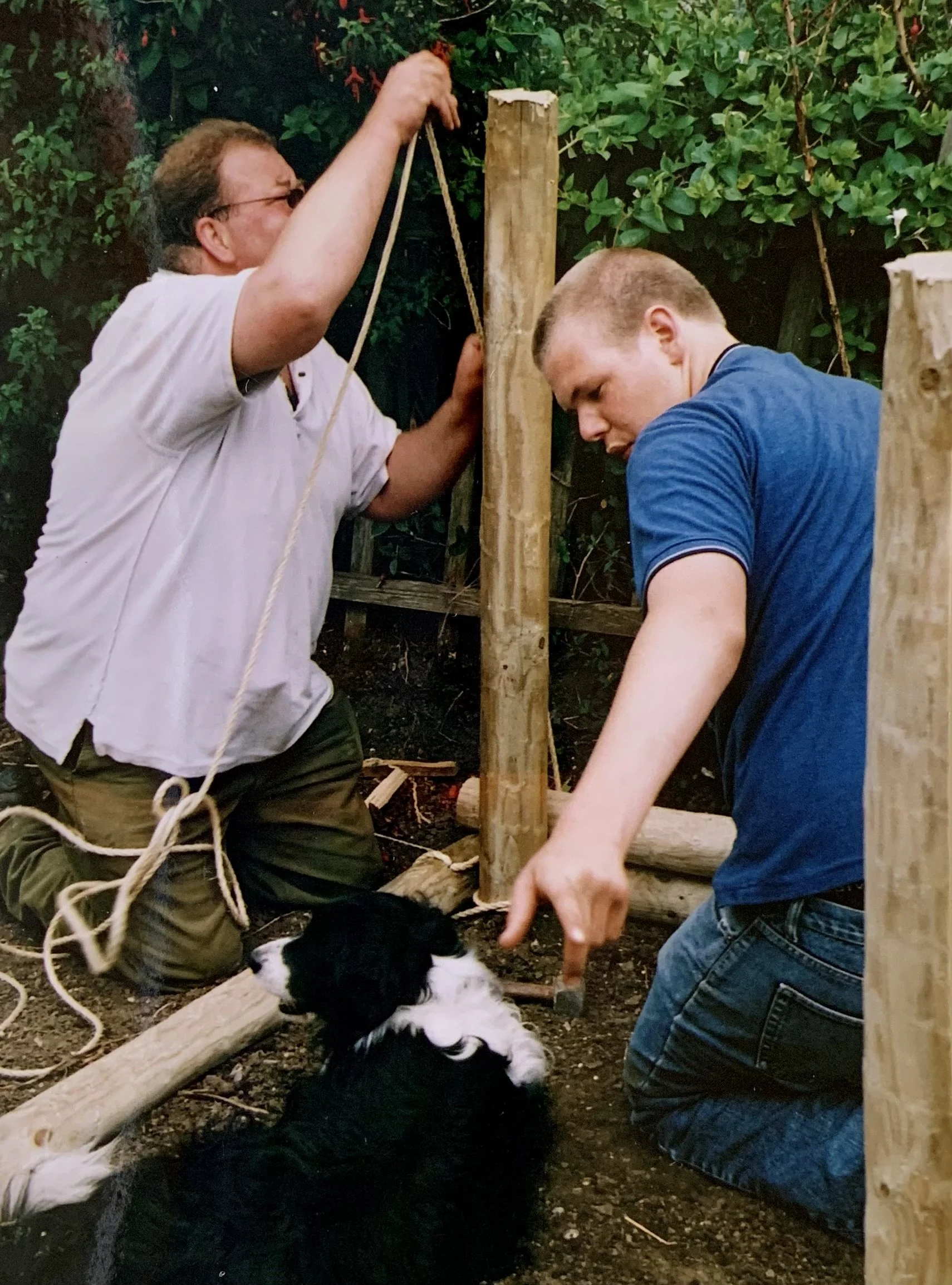 Two men building a wooden fence, one kneeling and one standing, with a black and white puppy nearby.