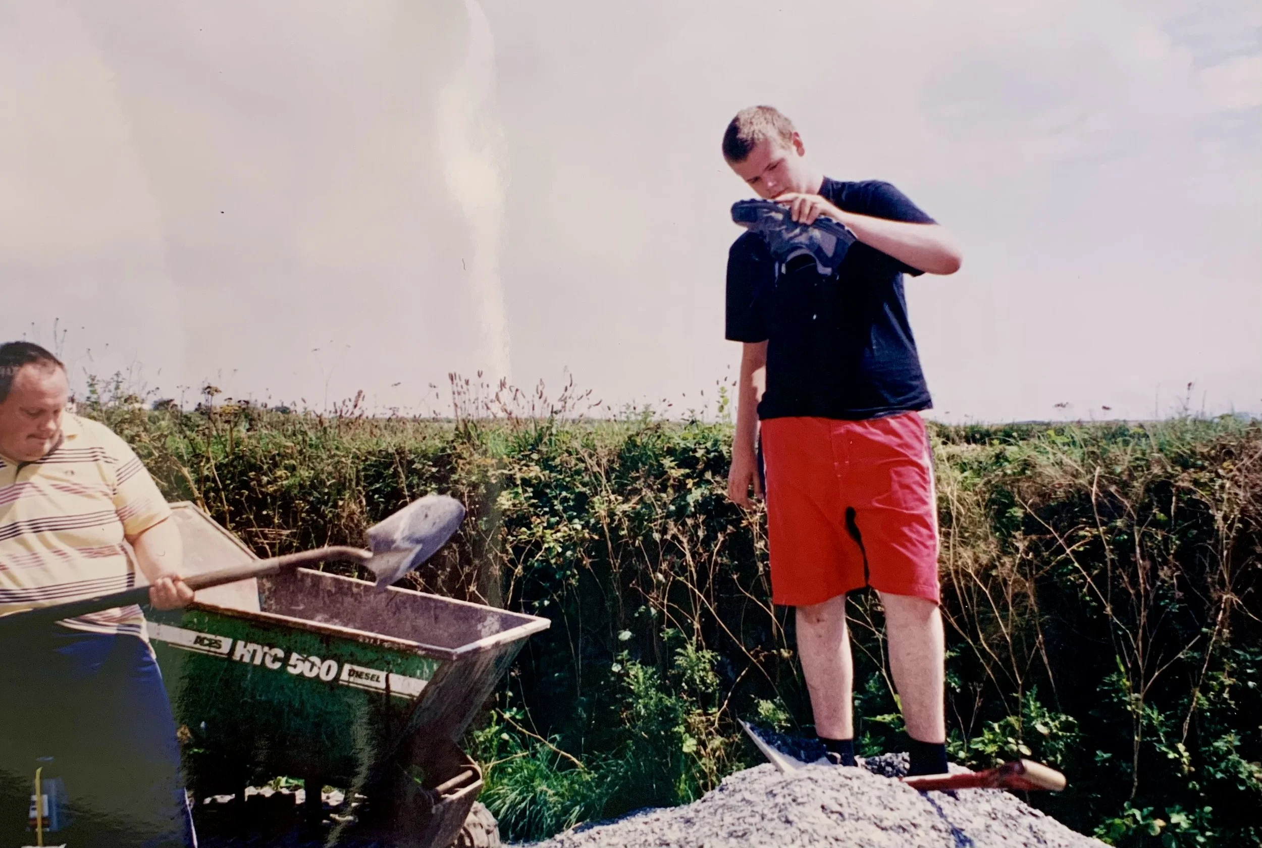 Two boys outdoors on a rocky area; one is shoveling dirt or gravel into a wheelbarrow, and the other is standing on a rock, looking at a camera or phone. There are shrubs and a cloudy sky in the background.