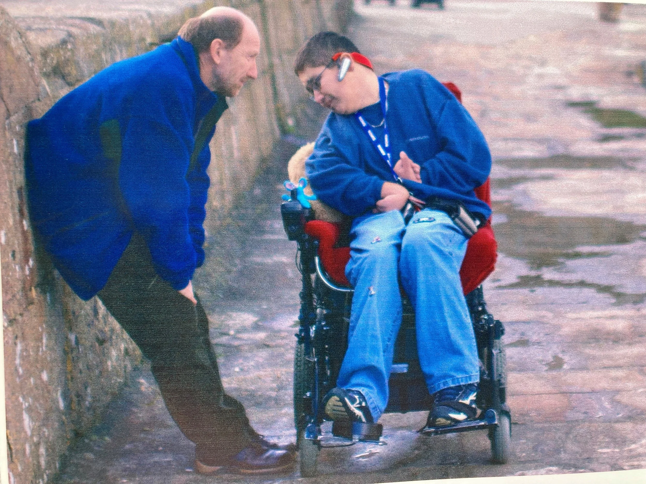 A man leans against a brick wall talking to a boy in a motorized wheelchair. Both are wearing blue jackets, and the boy in the wheelchair is smiling with his hands clasped together. The scene appears to be outdoors on a wet, stone-paved surface.