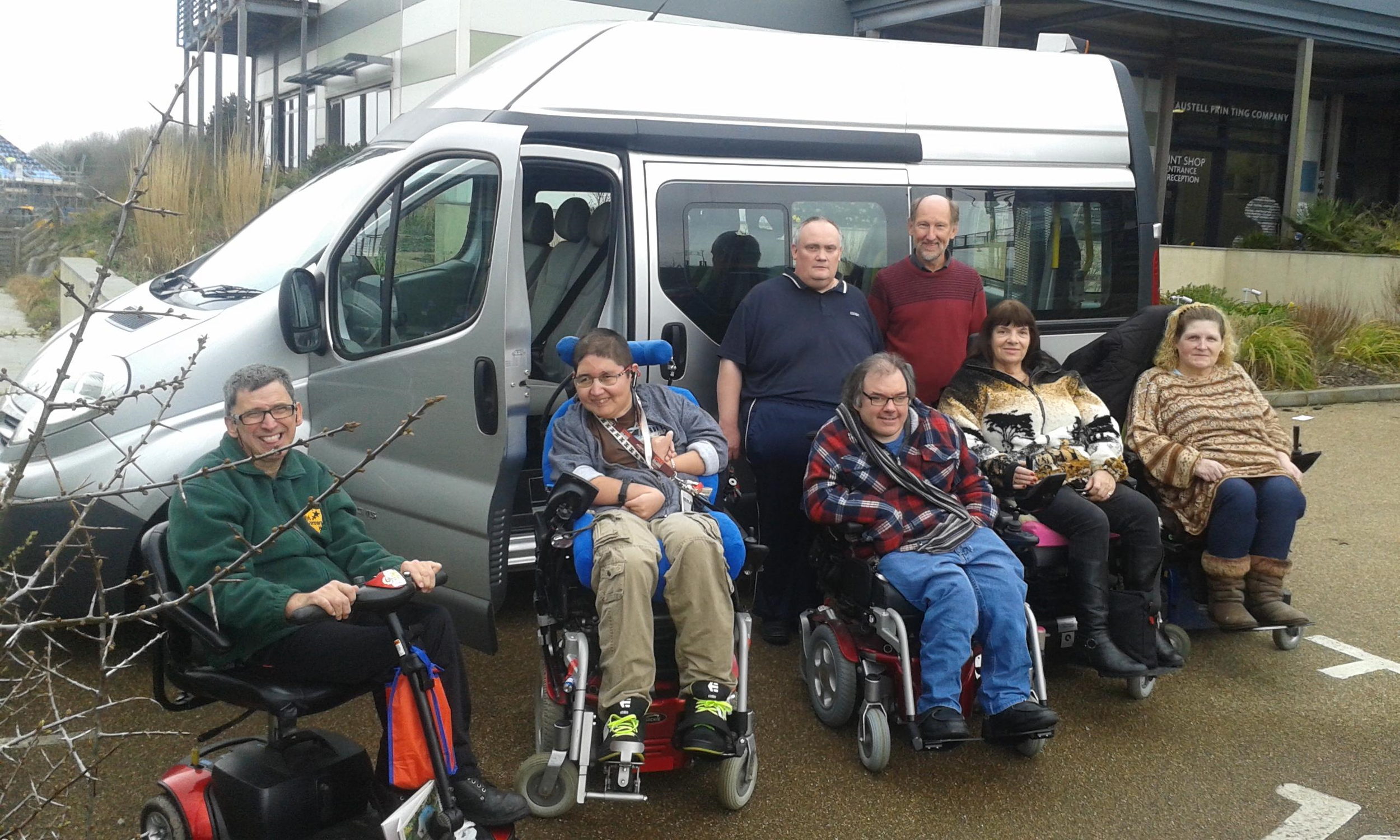 Group of seven people, some with disabilities, posing in front of a silver shuttle van outside a building. Three are seated in wheelchairs, while others stand or sit nearby, smiling.
