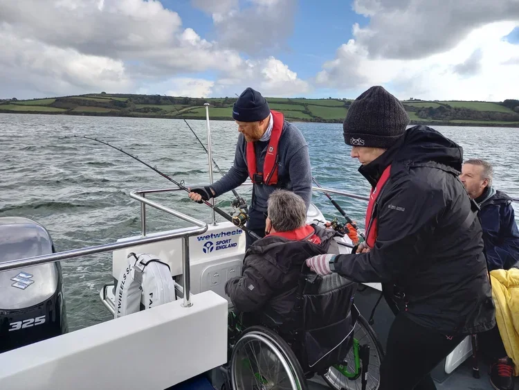Three men sitting on and around a red and white inflatable boat on a shallow water shoreline, with other inflatable boats and people in the background.